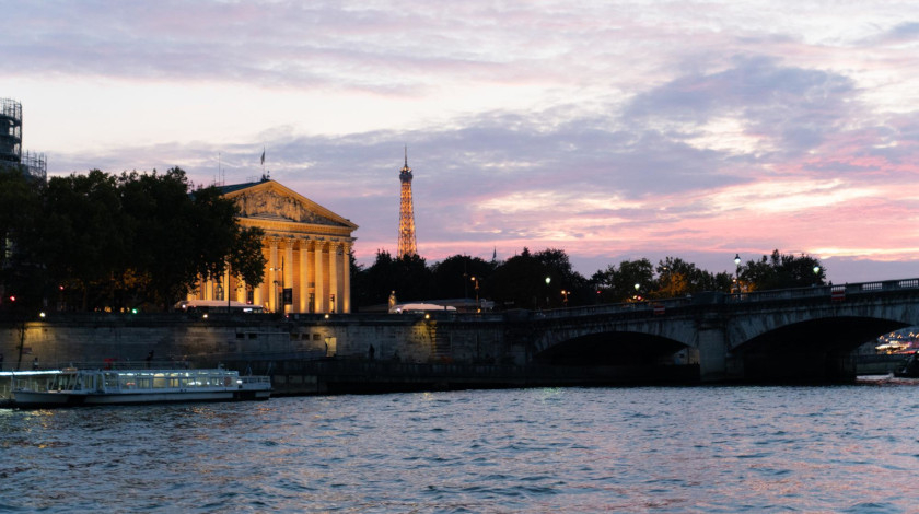 • Tour Eiffel et Palais Bourbon au coucher du soleil vus depuis la Seine avec un bateau de croisière à Paris