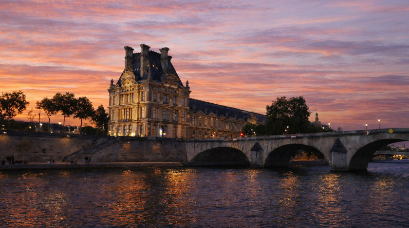 • Musée du Louvre et Pont du Carrousel au coucher du soleil vus depuis la Seine à Paris