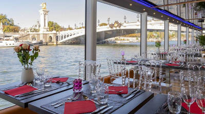 A refined 2-hour lunch cruise along the Seine, featuring bistronomic cuisine freshly prepared on board and French music in the background.